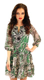 Unparalleled visual appeal in this effortlessly chic airy floral silk chiffon,printed with ethereal white flowers and neck panel in signature hand embroidery with crystals, sequins, black and white jet beads,silver metallic thread."Belle of the ball"look with slight ruffles on empire waist and hem,elastic waist on back for an exceptional dress,that will be the talk of the town.Maxi length can be ordered-$498.