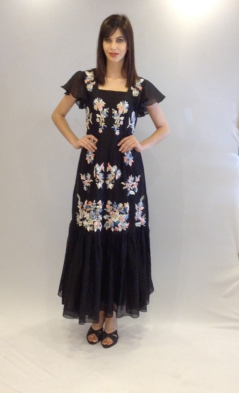 Magical dream like floral tribute, in this black chiffon maxi.Square neckline, ruffle hem and flutter sleeves,create a visionary style to wear to the next black tie formal event. The dress can be ordered with long sleeves.