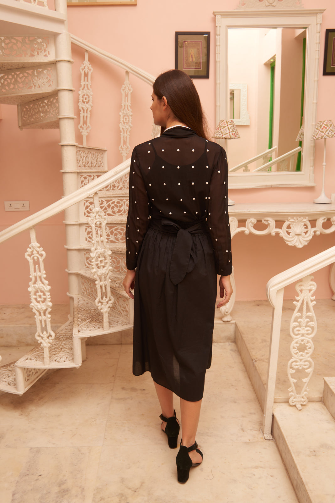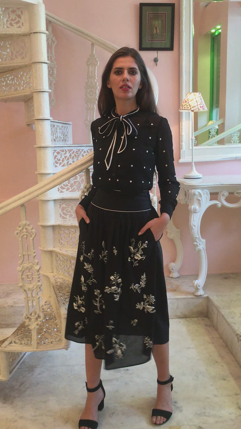 Effortless style prevails in this polka dotted silk chiffon pussy bow blouse.Innumerable ways of wearing this versatile style -over pants, skirts or shorts.
